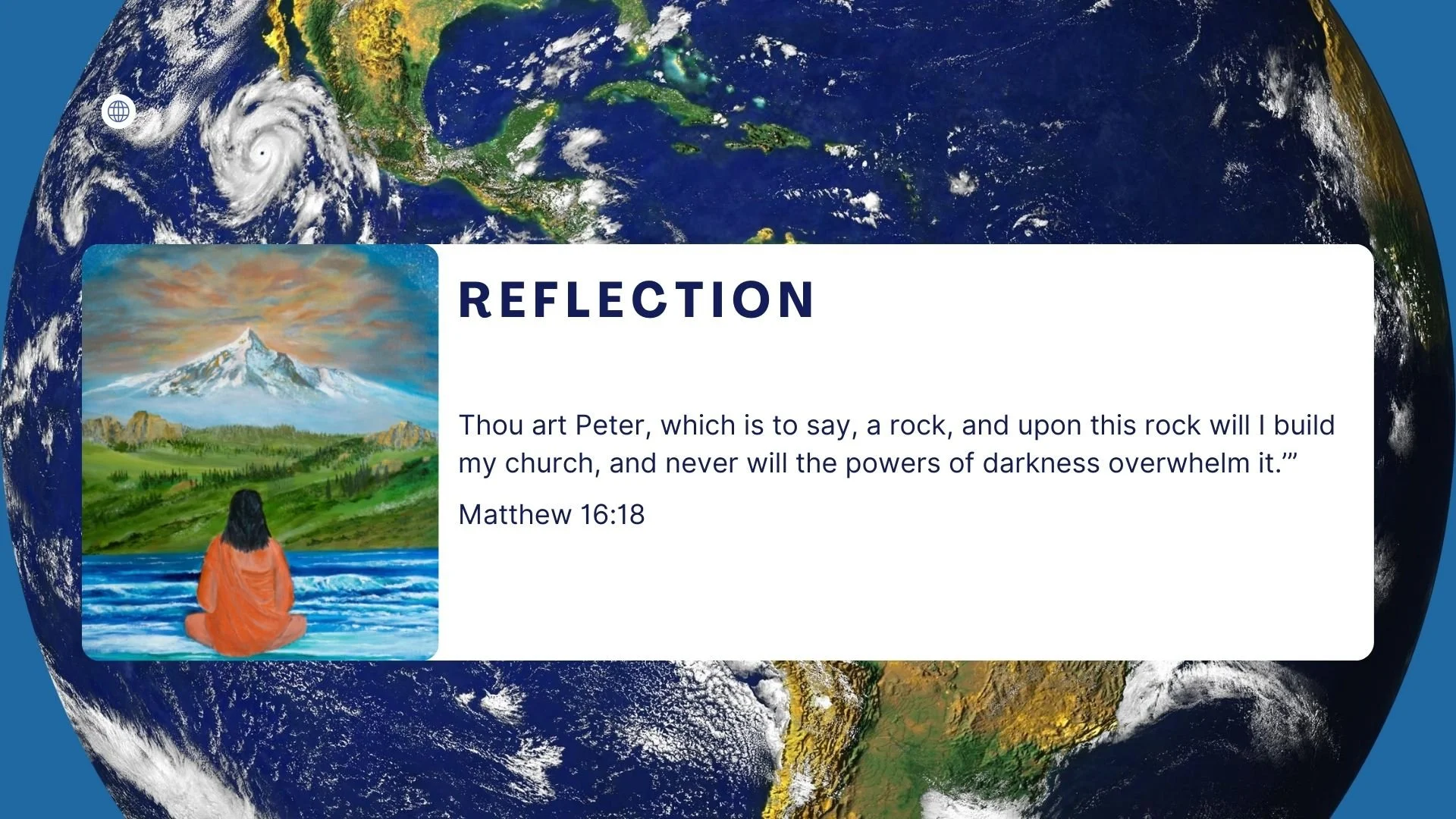“And Jesus turned to him, saying, ‘Blessed art thou, Simon, son of Jonah: for not by human nature was this truth revealed to thee, but by my heavenly Father. And I tell thee this also: Thou art Peter, which is to say, a rock, and upon this rock will I build my church, and never will the powers of darkness overwhelm it.’”